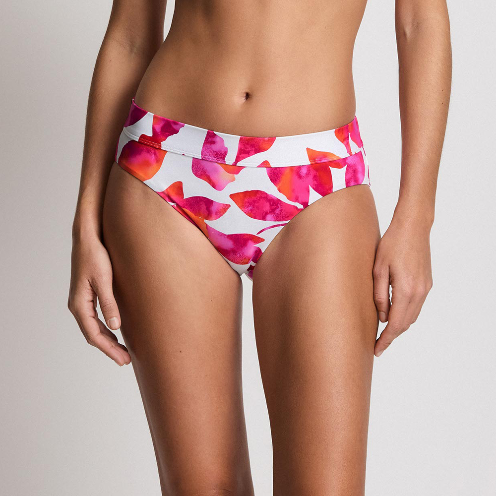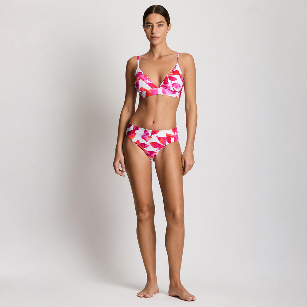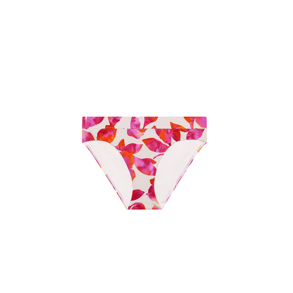 Designed with a perfect balance of modern style and timeless sophistication, these bikini bottoms feature a painterly floral motif in a striking palette of fuchsia, coral, and soft pink.
