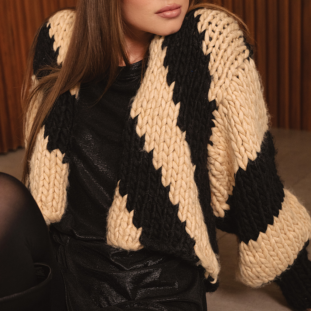 Waffle Stitch Floral Embroidered Sleeves Sweater Brown