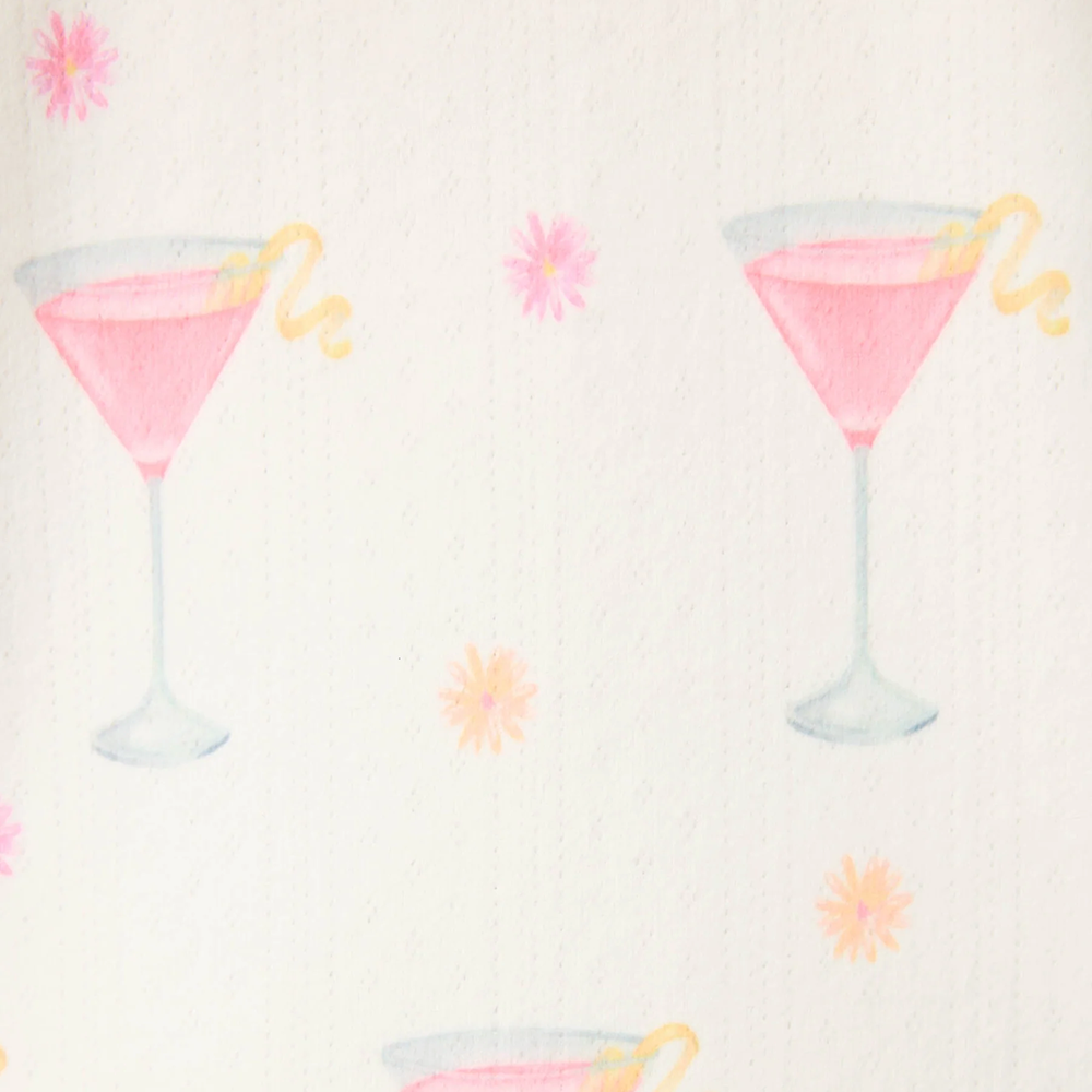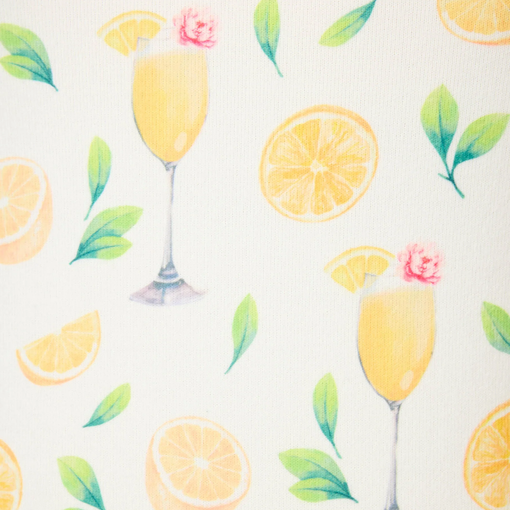 Cheers to sleeping in and bottomless at-home brunch. This three-piece PJ set is made from buttery-soft jersey that’s cool to the touch and stretchy in all the right ways. The allover mimosa or martini print brings the vibe—bubbly flutes, juicy citrus, and sprigs of green or pink martinis and pastel flowers. Comes with a short-sleeve button-down top, drawstring shorts, and a matching headband. Perfect for lounging, sleeping, or coordinating with the bridal crew.