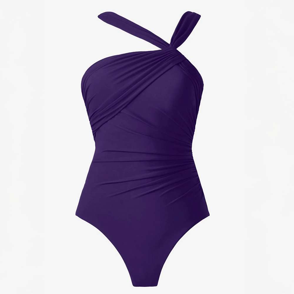 This full control swimsuit stuns with a unique asymmetrical halter style neckline and allover shaping for a sleek silhouette.